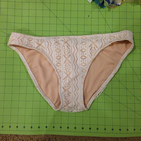Next, I set my sights on myself... I have a Princess Tiana costume I want to make AND it's BATHINGSUIT CLEARANCE SEASON! Naturally, I went nuts in Target and I found this cute bikini bottom which was nude with cream crochet. I kept imagining how hot I'd look on the beach with my man friend while wearing it and I HAD to have it, yet there was NO MATCHING TOP. Well, I take that back, after going to three targets I found the top in an XS. So, I bought three XL bottoms and started making my own top: